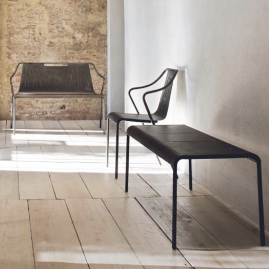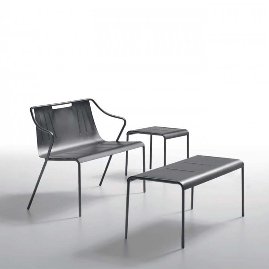 Ola Couchtisch mit Struktur und Platte aus lackiertem Metall oder Industrieeffekt.