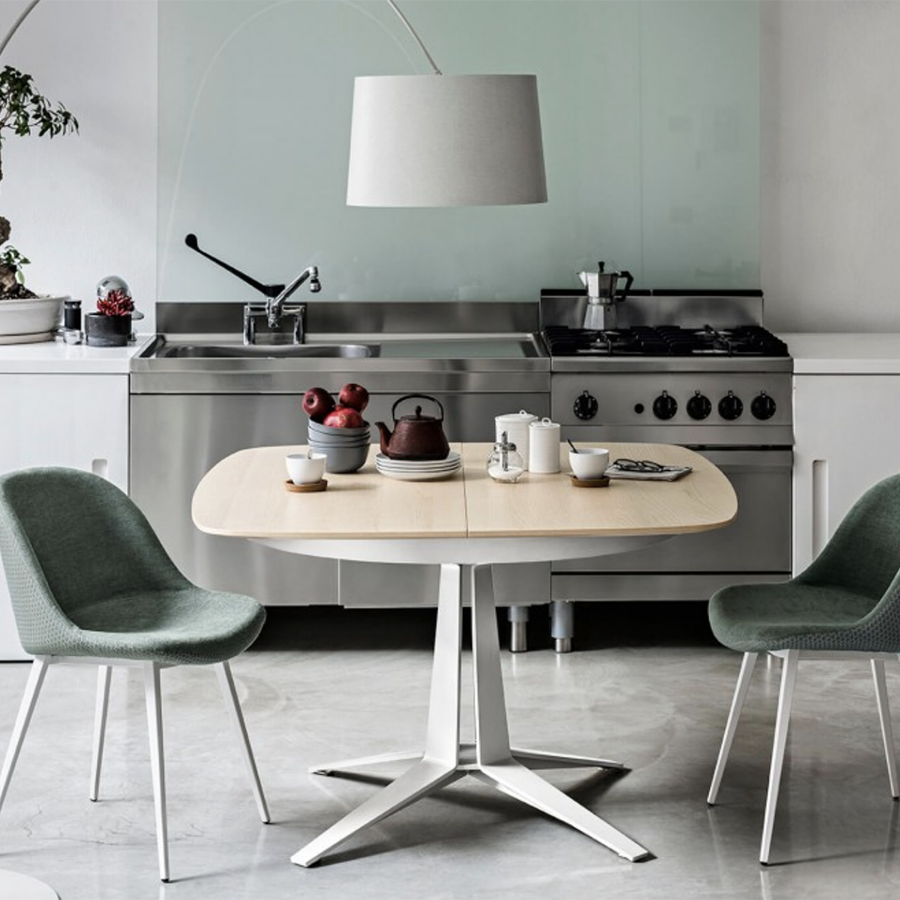 Der Ausziehtisch Link zeichnet sich durch elegante Rundungen und ein solides Vierstern-Fußkreuz aus.