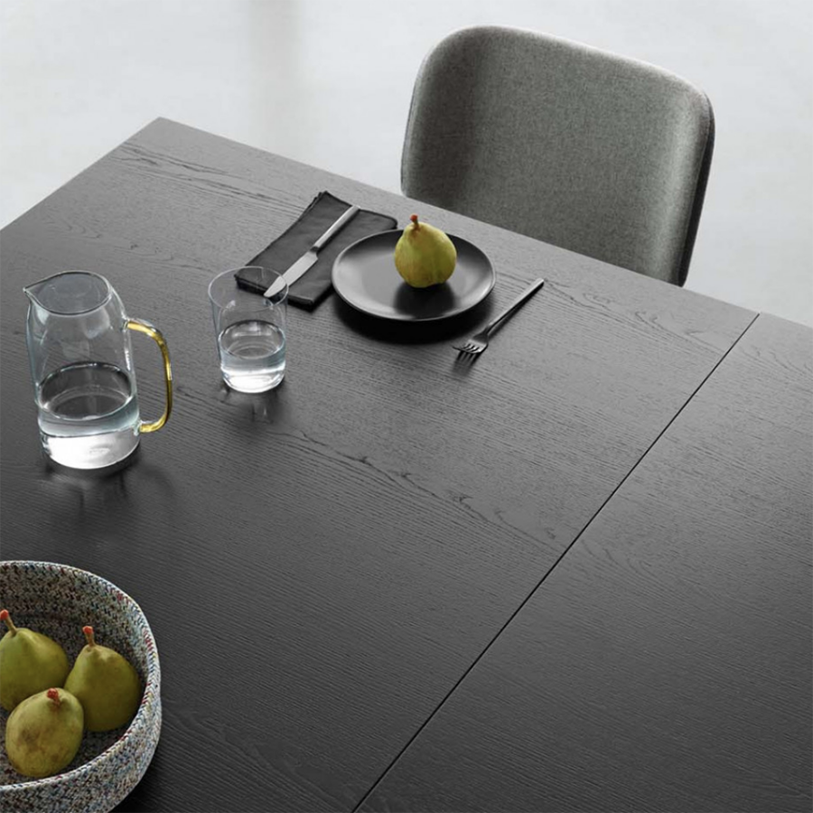 Tischplatte und Verlängerungen aus Glas, Kristallkeramik oder furniertem Holz in Esche, Eiche oder Nussbaum.