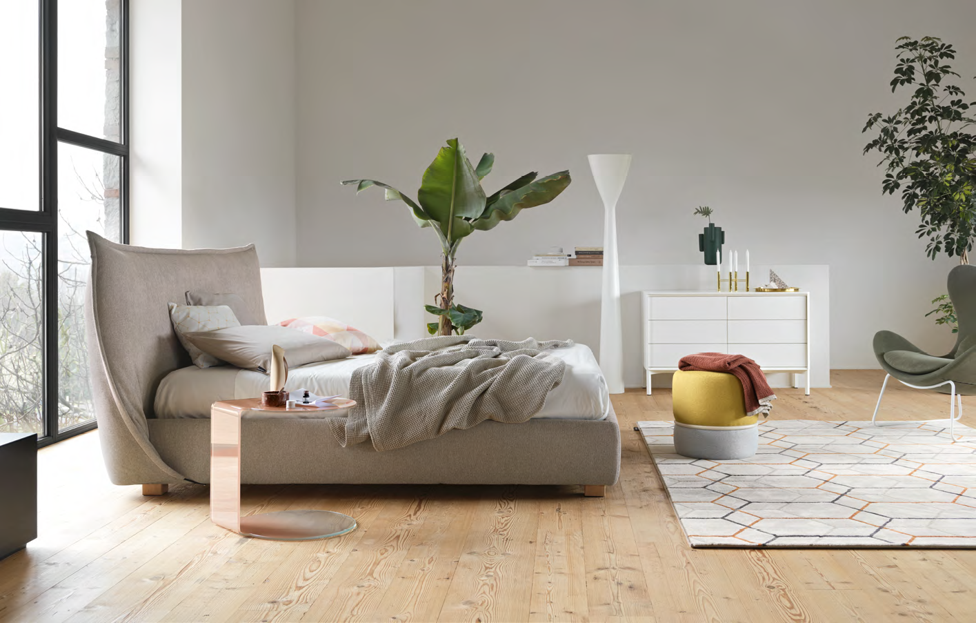 Weiches Doppelbett, mit Stoff bezogen und komplett abnehmbar. Dieses Bett lädt mit seinen weichen und bequemen Linien zum Rückzug und Entspannen ein. Das große, weich gepolsterte Kopfteil ist das charakteristische Detail. Das Softly-Bett bietet angenehmen Alltagskomfort, ohne auf Eleganz zu verzichten.