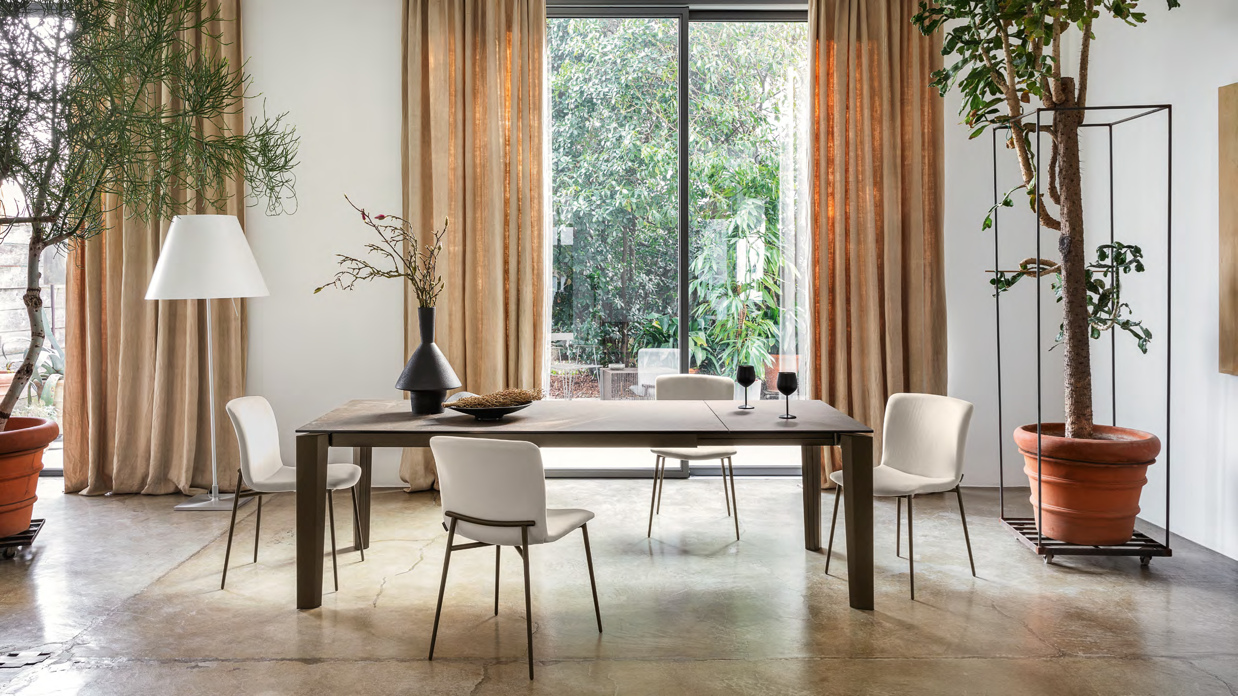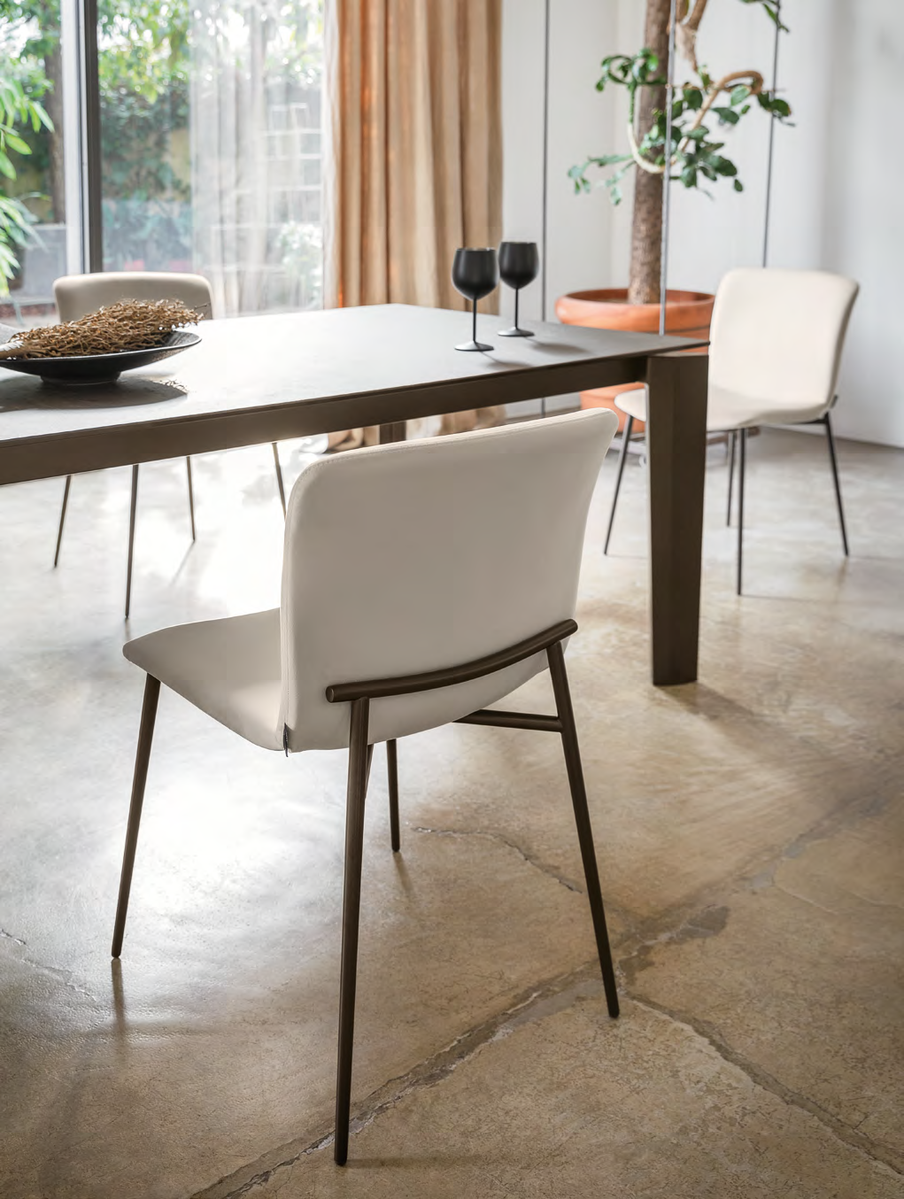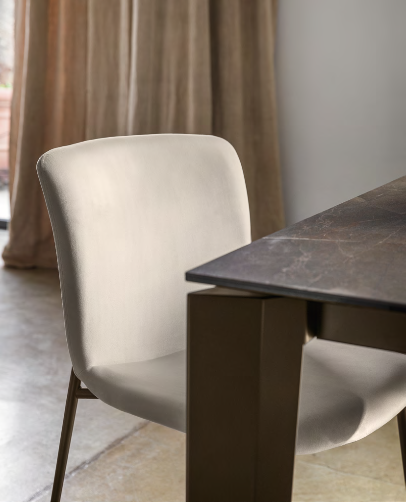 Das prägende Detail, das alle Elemente der Kollektion vereint, ist ein Motiv auf der Rückenlehne, das durch die Verlängerung der Metallbeine bis in die Rückenlehne selbst entsteht. Dieses markante Stilelement vermittelt eine einzigartige Beziehung zwischen dem Stoffsitz und der tragenden Struktur. Die üppige Polsterung und die exquisite Verarbeitung der Metallrahmen machen Love zu einem kleinen Luxus für jeden Tag.