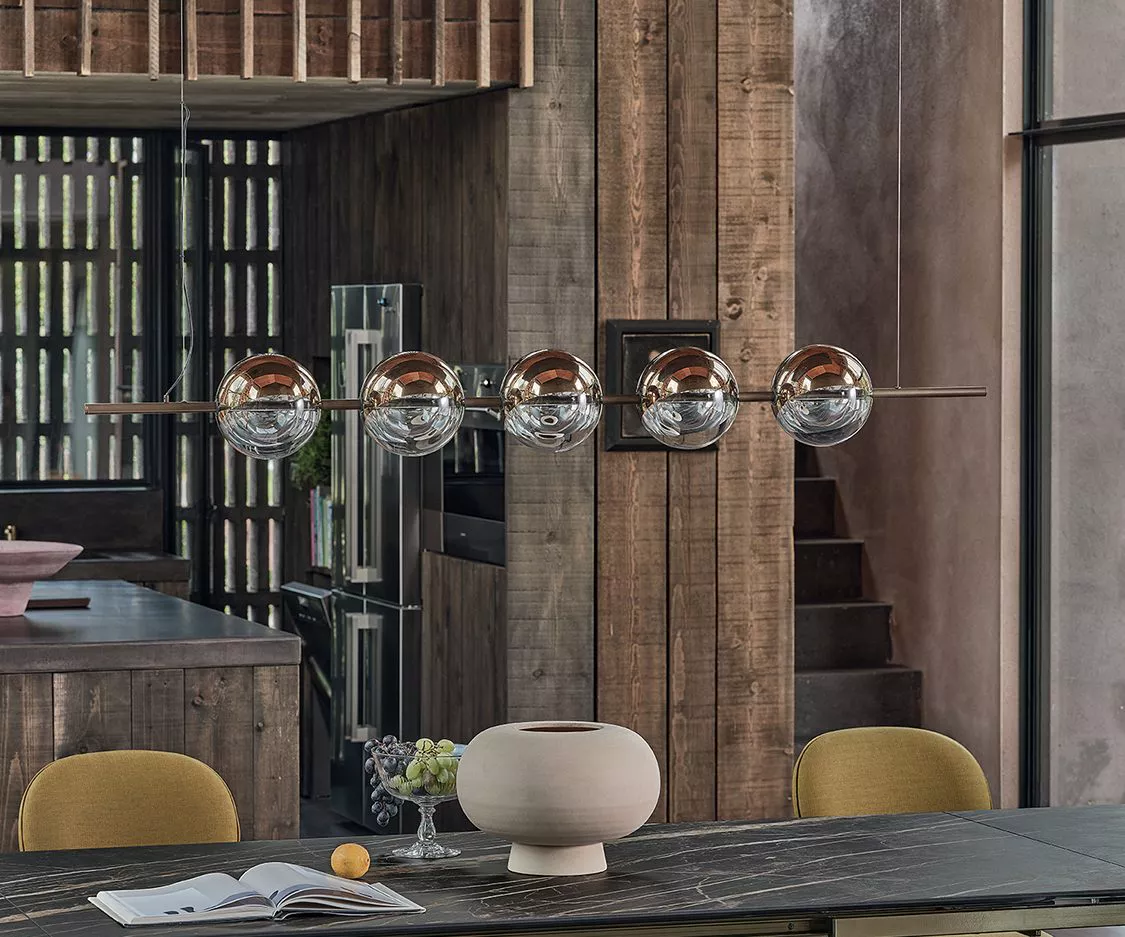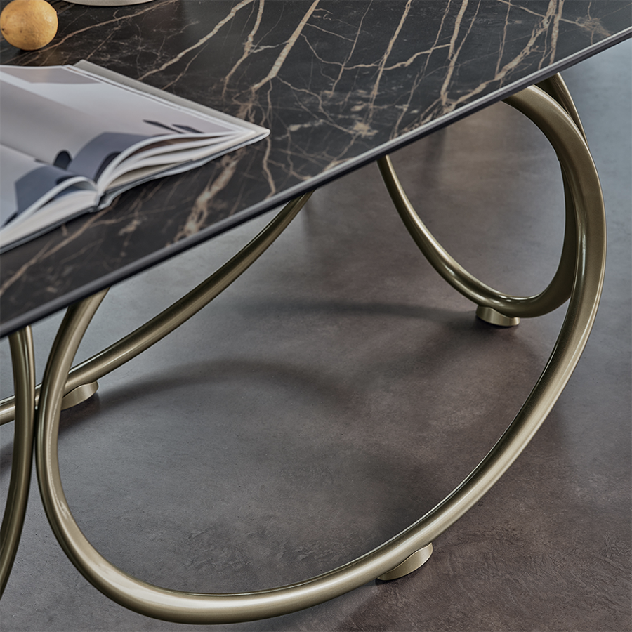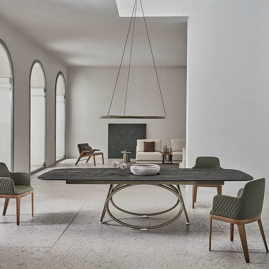 Das Gestell zeichnet sich durch konzentrische geometrische Linien aus, die seine markante Persönlichkeit unterstreichen. Gefertigt aus lackiertem Stahl, ist es in verschiedenen Ausführungen erhältlich – von Antikmessing bis Gold – und bietet so unterschiedliche Looks. Je nachdem, ob Sie sich für eine Tischplatte aus Holz, Glas, SuperMarble oder SuperCeramic entscheiden, fügt es sich harmonisch in jedes Ambiente ein: Die vielfältigen Gestaltungsmöglichkeiten beweisen seine bemerkenswerte Vielseitigkeit.