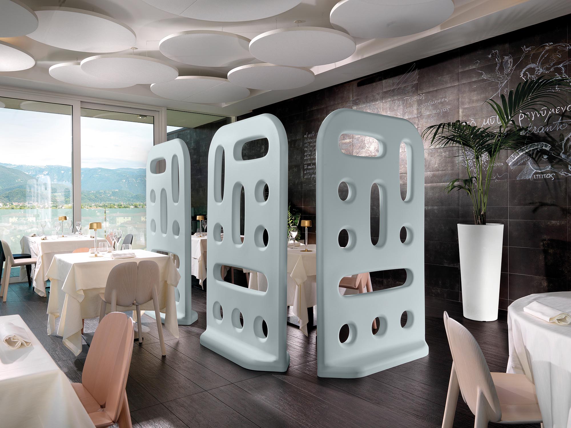 Ein einfacher, aber sehr vielseitiger Raumteiler, der die Möglichkeit bietet, dynamische Unterteilungen innerhalb desselben Raums zu schaffen. Die Löcher sorgen nicht nur für angenehme geometrische Ansichten, sondern lassen auch Licht durch, erzeugen stimmungsvolle Schatten und gewährleisten außerdem eine natürliche Belüftung, die ideal für die Aufrechterhaltung einer luftigen und komfortablen Umgebung ist.