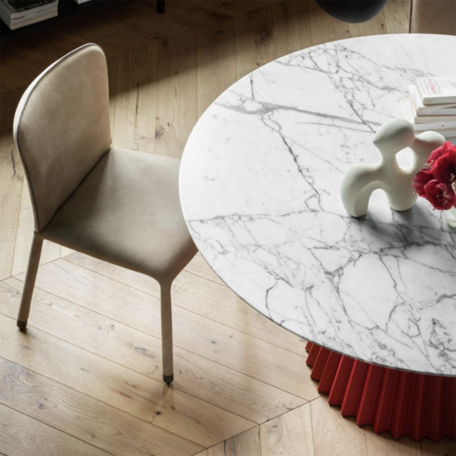 Tisch mit zentralem Sockel aus lackiertem Metall. Runde Platte aus furniertem Holz, Kristallkeramik oder Marmor (Version ø180 nicht in Kristallkeramik erhältlich).
