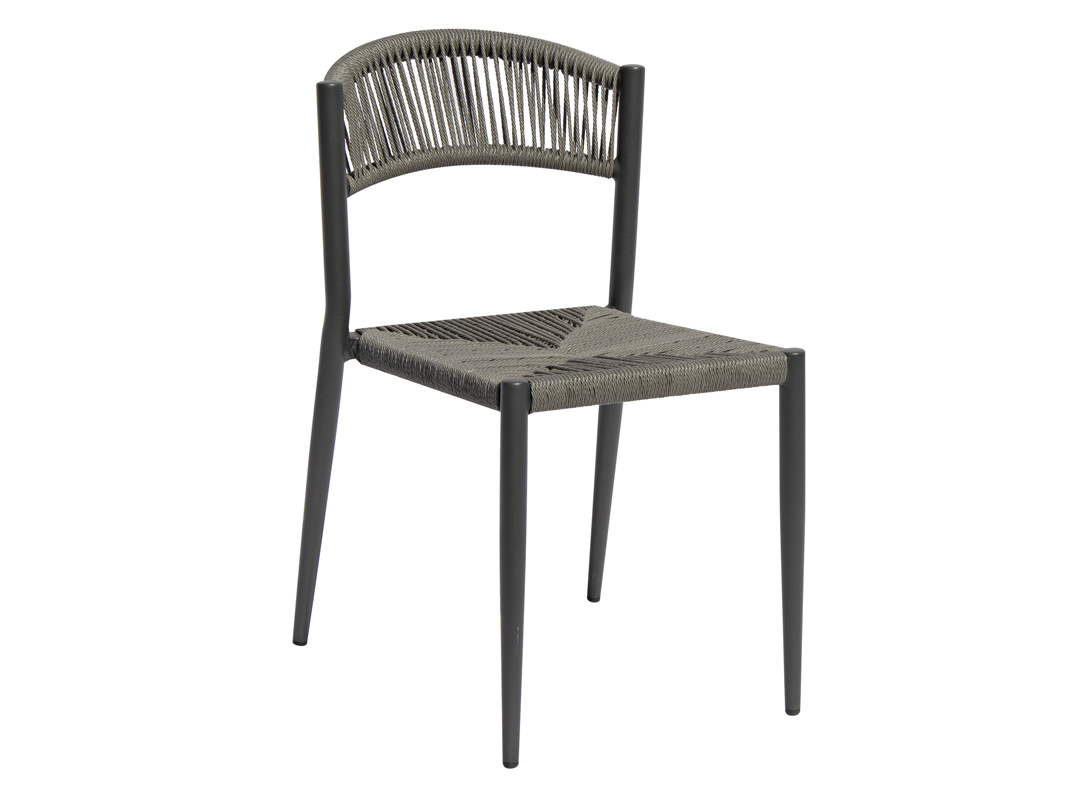 Sitzfläche und Rückenlehne bestehen aus 5 mm starkem, grauem, gedrehtem Rattan, einem Flechtmaterial, das Komfort und eine elegante, moderne Ästhetik vereint. Diese Ausführung fügt sich harmonisch in verschiedene Einrichtungsstile ein, sowohl im Innen- als auch im Außenbereich.