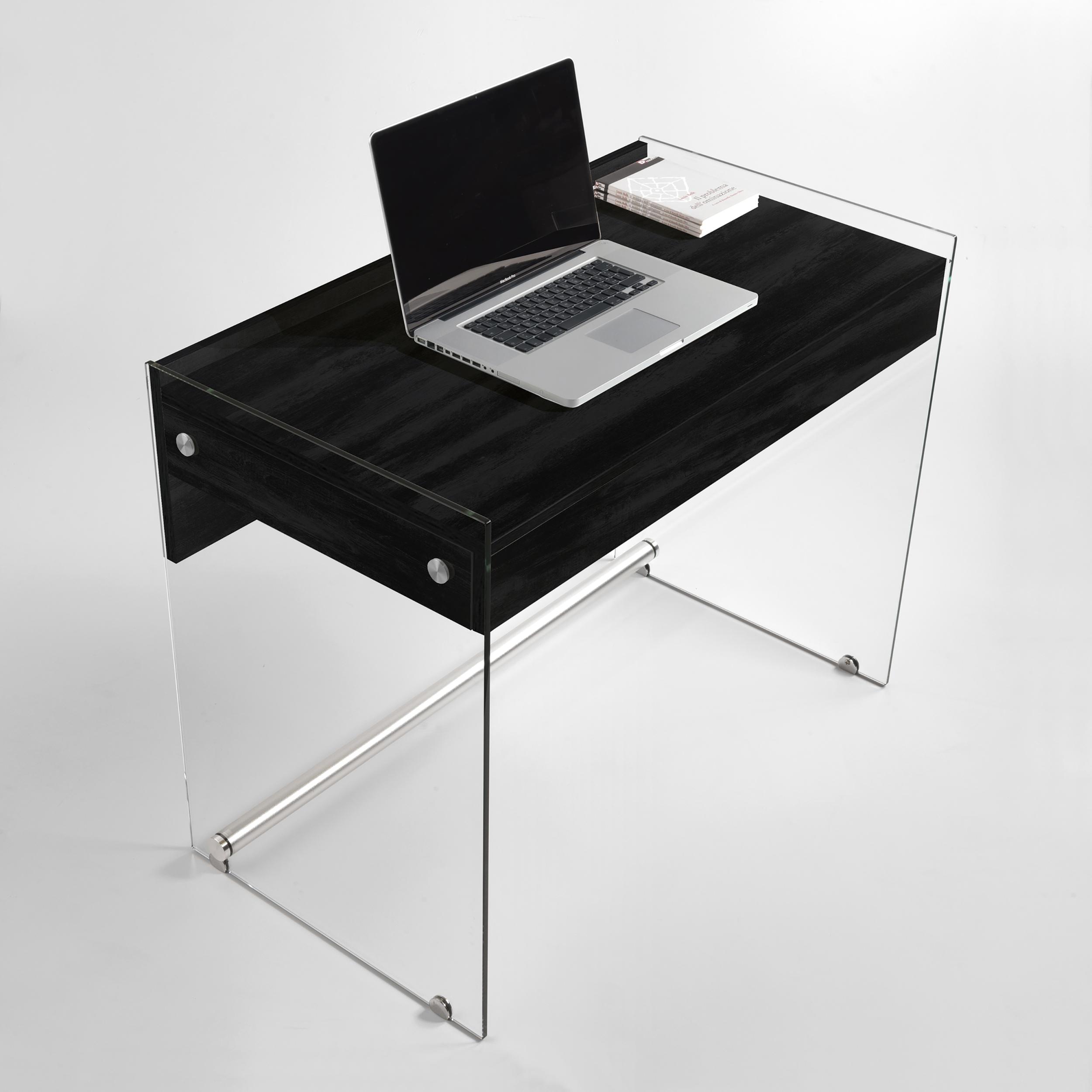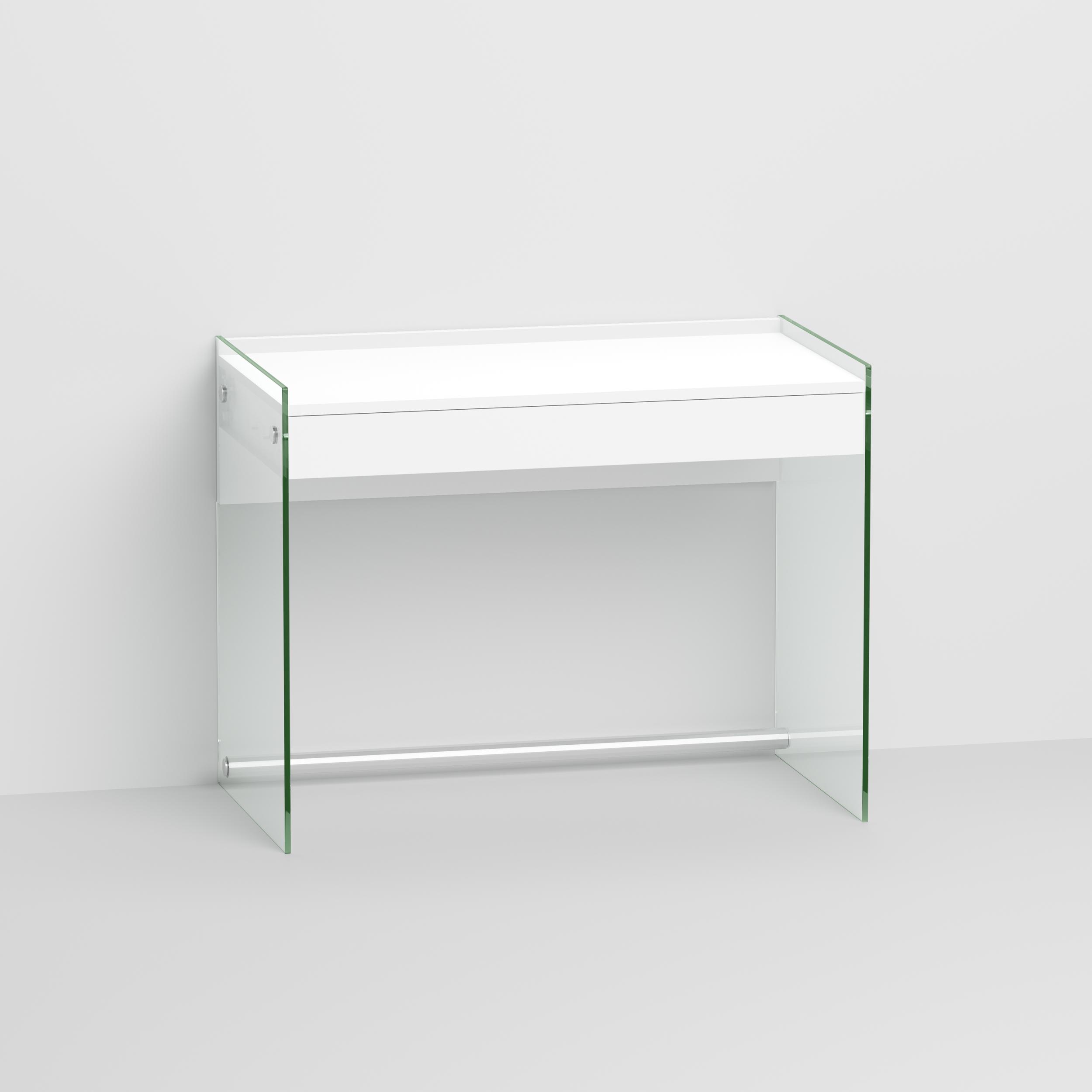 Moderner Schreibtisch. Das Gestell besteht aus zwei eleganten Seitenteilen aus 10 mm starkem, klarem oder rauchgrauem Sicherheitsglas. Die Ablagen und die geräumige Schublade sind aus 18 mm starkem, umweltfreundlichem Laminat gefertigt. Die Beschläge bestehen aus satiniertem Aluminium (bei klarem Glas) bzw. mattschwarz eloxiertem Aluminium (bei rauchgrauem Glas).