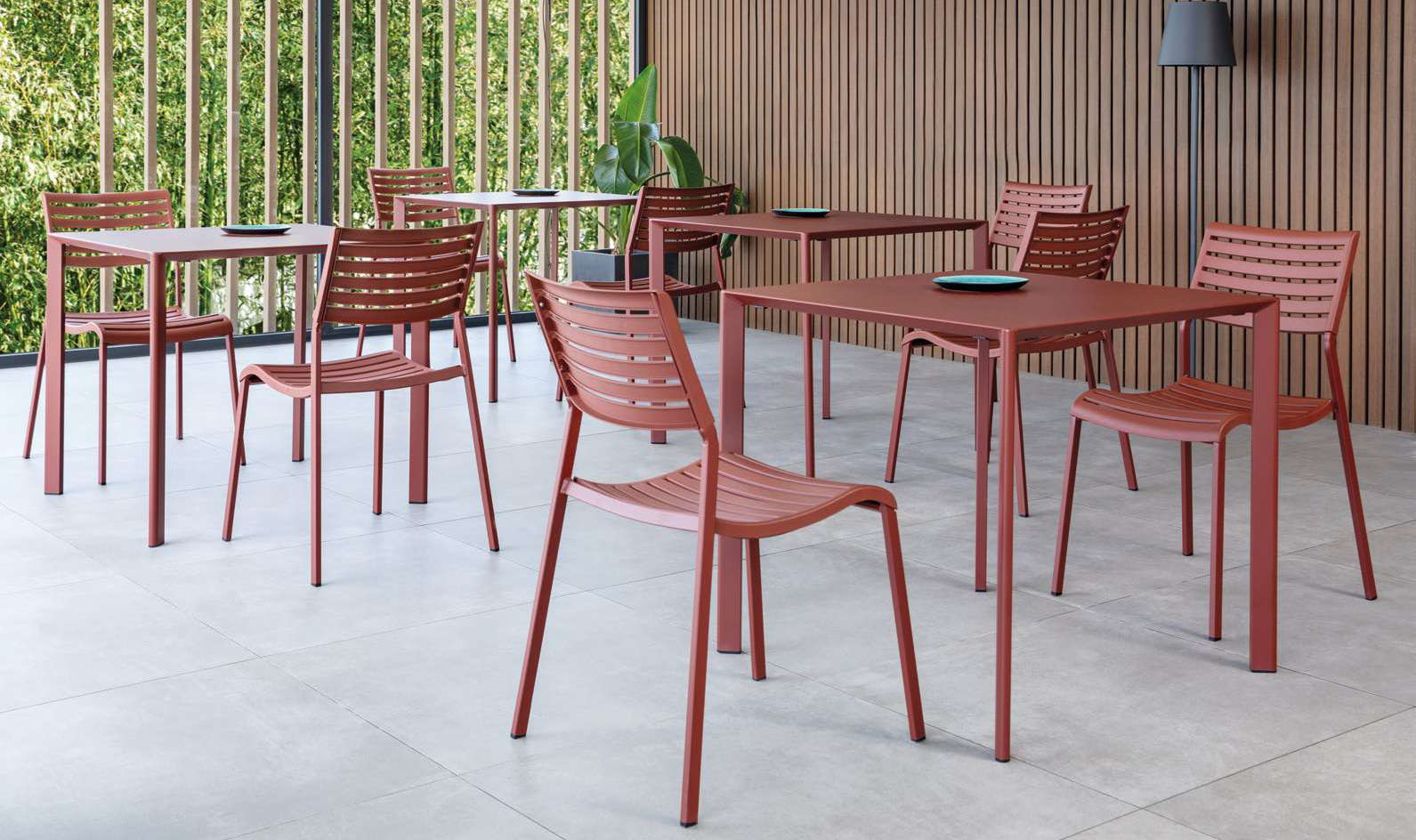 Der Stuhl Nina von Vermobil. Ein schlichtes Design, das mit einer eleganten und zeitlosen Silhouette die Persönlichkeit des Stuhls unterstreicht. Stuhl aus verzinktem Stahl mit Sitzfläche und Rückenlehne aus Polypropylen.