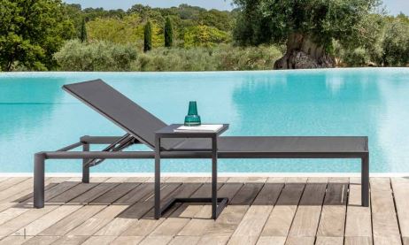Die Outdoor-Sonnenliege aus der Nunù-Kollektion von talenti verfügt über elastische Kunstharzgurte, eine Rückenlehne und Sitzfläche aus Textilene sowie einen lackierten Aluminiumrahmen.
