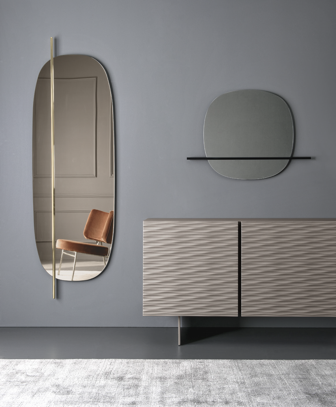 Vanity, ein Bestseller von Calligaris, kontrastiert die Schlichtheit einer reinen Spiegeloberfläche mit einem dekorativen Metallelement, wodurch die formale Kontinuität aufgebrochen und ein Hauch von Stil hinzugefügt wird. Vanity ist in verschiedenen Größen erhältlich und vereint Ästhetik und Funktionalität auf perfekte Weise.