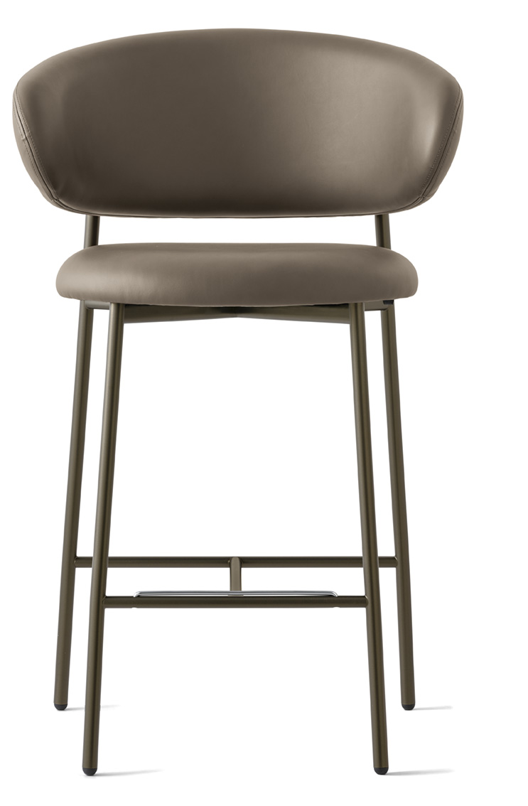 Sitzmöbel mit Fokus auf Komfort: Sitzflächen und Rückenlehnen zeichnen sich durch großzügige und weiche Polsterung aus, die in verschiedenen Bezugsarten erhältlich ist. Oleandro ist an der charakteristischen Abflachung der Rückenlehne zu erkennen, die sowohl in der Holz- als auch in der Metallausführung vorhanden ist. Die Sitztiefe, die großzügige Polsterung und die umhüllenden Linien verleihen Stühlen und Hockern zusätzlichen Komfort.