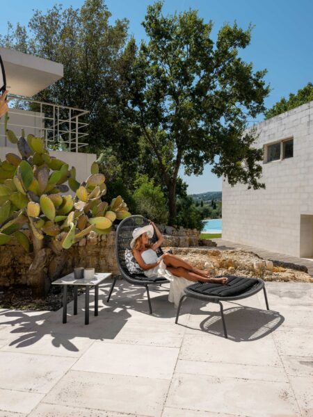 Der Panama Lounge Chair wurde entworfen, um den ganzen Körper in Momenten der Entspannung zu umschließen. Komfortabel und funktional, zeichnet er sich durch seine niedrige Sitzfläche aus, die von einem Aluminiumrahmen getragen wird, der mit gewebten, synthetischen Tauen bespannt ist. Dank seiner wetterbeständigen Materialien eignet sich der Lounge Chair ideal als Gartenmöbel und erinnert mit seinen weichen, fließenden Linien an die Formen der Natur.