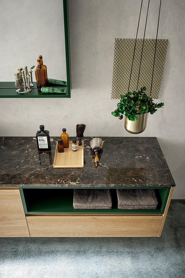 Mit einem fröhlichen, grünen, vielseitigen, raffinierten, essentiellen, dekorativen und modernen Charakter ist Pandora die neue Kios-Linie, die ihre Werte und die Originalität des Made in Italy maximal zum Ausdruck bringt. Pandora ist ein modulares System mit einer Nutöffnung in der gleichen Ausführung wie das Möbelstück. Die neuen Essenzen mit Holzeffekt erzeugen einen natürlichen, materiellen und haptischen Geschmack. Die neuen zeitgenössischen Spiegel in geometrischen oder geschwungenen Formen charakterisieren die neue Pandora-Linie, die jedem Geschmack und Stil gerecht wird. Dieser Vorschlag ist die vollständige Zusammenstellung von allem, was auf den Fotos zu sehen und in der Tabelle am Ende der Beschreibung aufgeführt ist. Diese präzise Komposition zeichnet sich durch die Platte aus Emperador Brown-Marmor aus.