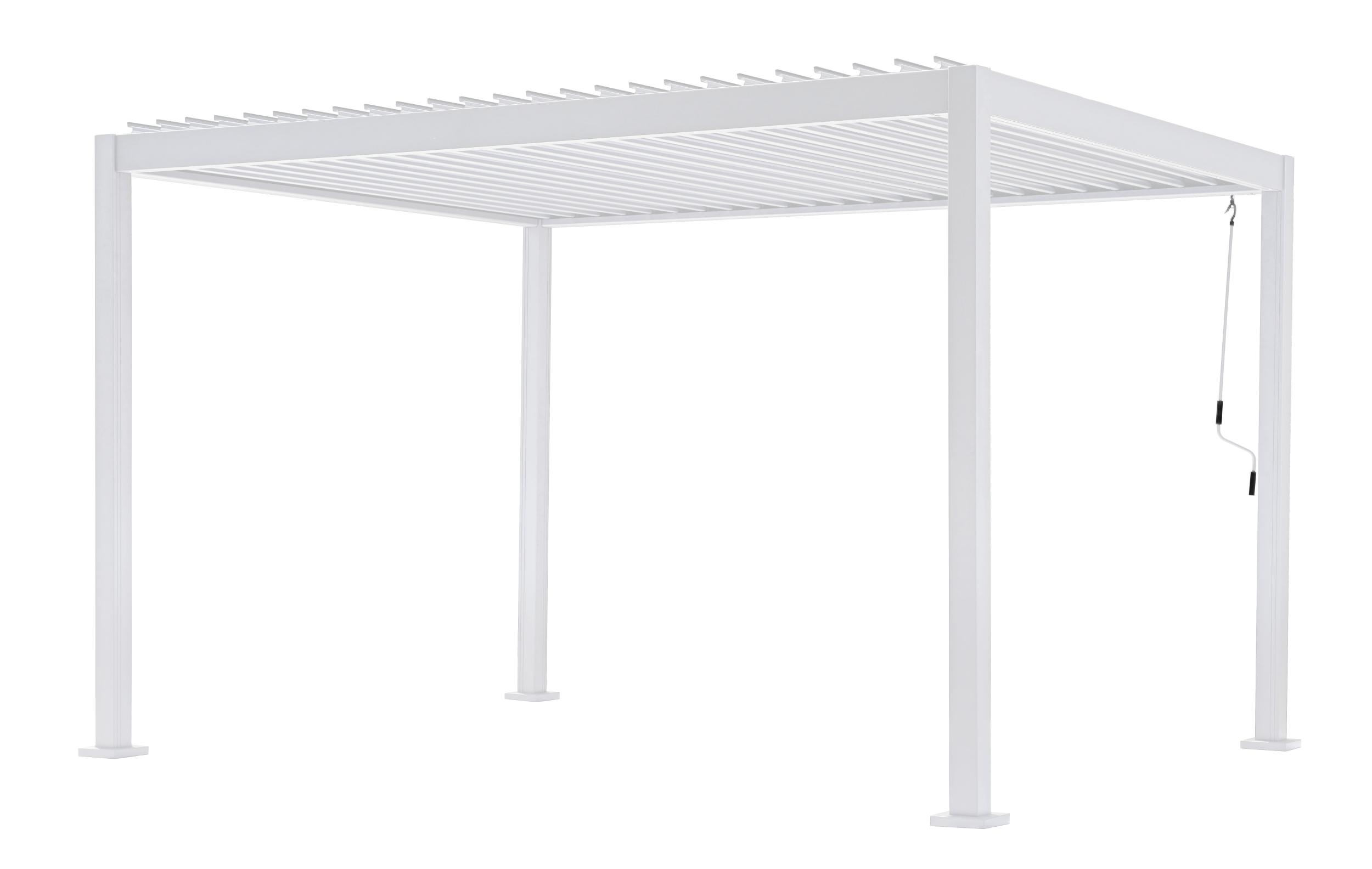 Dachquerträger 145 x 80 x 1,3 mm, Lamellen 162 x 27 x 1,2 mm, Lamellendach durch Kurbel verstellbar, max. Höhe 2,50 m, Wasserablaufsystem in den Tragstangen integriert.