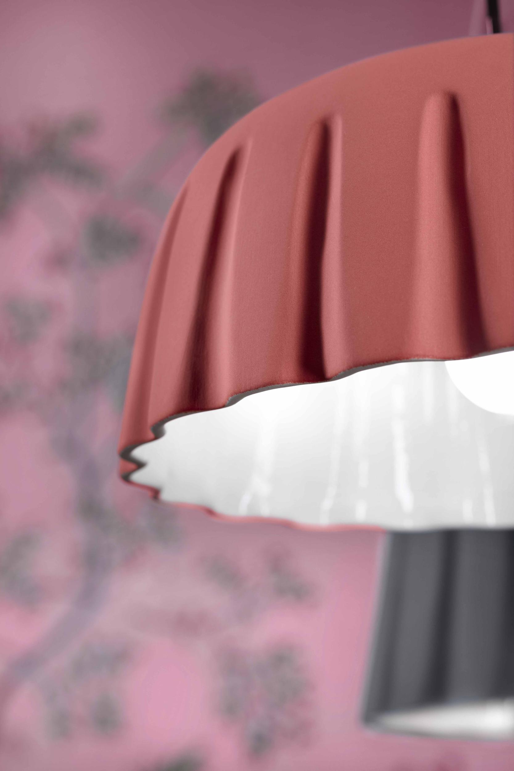 Mit seinen wellenförmigen Oberflächen und vertikalen Schnitzereien, die sich entlang seines gesamten Umfangs wiederholen, erinnert uns der Madame Grès-Diffusor eher an ein plissiertes Kleidungsstück oder eine weiche, wellige Textilverpackung als an ein starres und statisches Element. Seine Oberflächen sind mit einer opaken Engobe-Oberfläche versehen, die die Formen noch weicher macht und sie weich und seidig macht. Sie öffnen sich um die Lichtquelle herum und erzeugen einen breiten Lichtstrahl, der die Umgebung gleichmäßig beleuchtet.