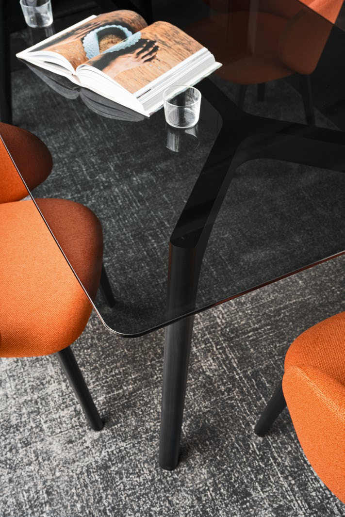 Pod CB4862-FB Tisch von Connubia mit Buchengestell und Tischplatte aus gehärtetem Glas. Pod ist ein eleganter und moderner Tisch, der die warme und robuste Natur von Holz mit der ätherischen und modernen Optik von Glas in einem faszinierenden Kontrast verbindet. Das Massivholzgestell verleiht den hellen, transparenten oder Rauchglasplatten besondere Stabilität und Robustheit. Diese lassen die raffinierte Verarbeitung des Holzes erkennen, das fein abgeschrägt und geglättet ist, um Oberflächen und Profile zu erhalten, die die Schönheit der Maserung hervorheben. Die konischen Beine verleihen Dynamik und Leichtigkeit, und die organische Verbindung zwischen ihnen und dem Querträger stellt ein markantes Detail dar.