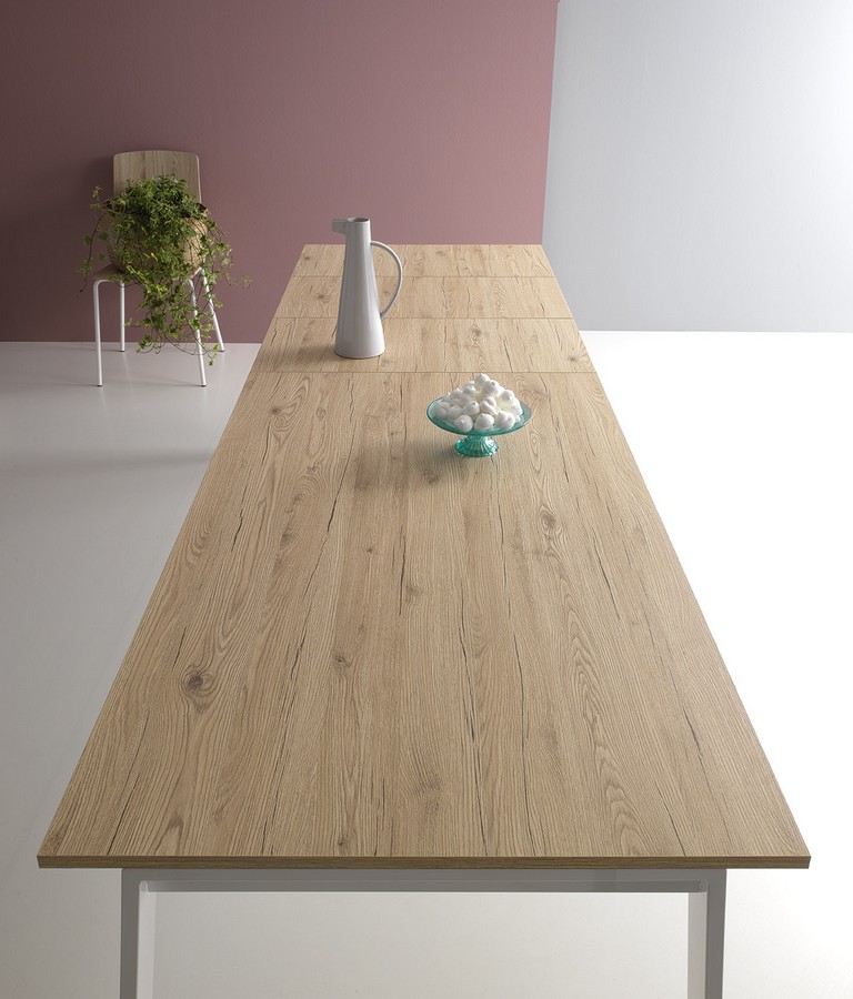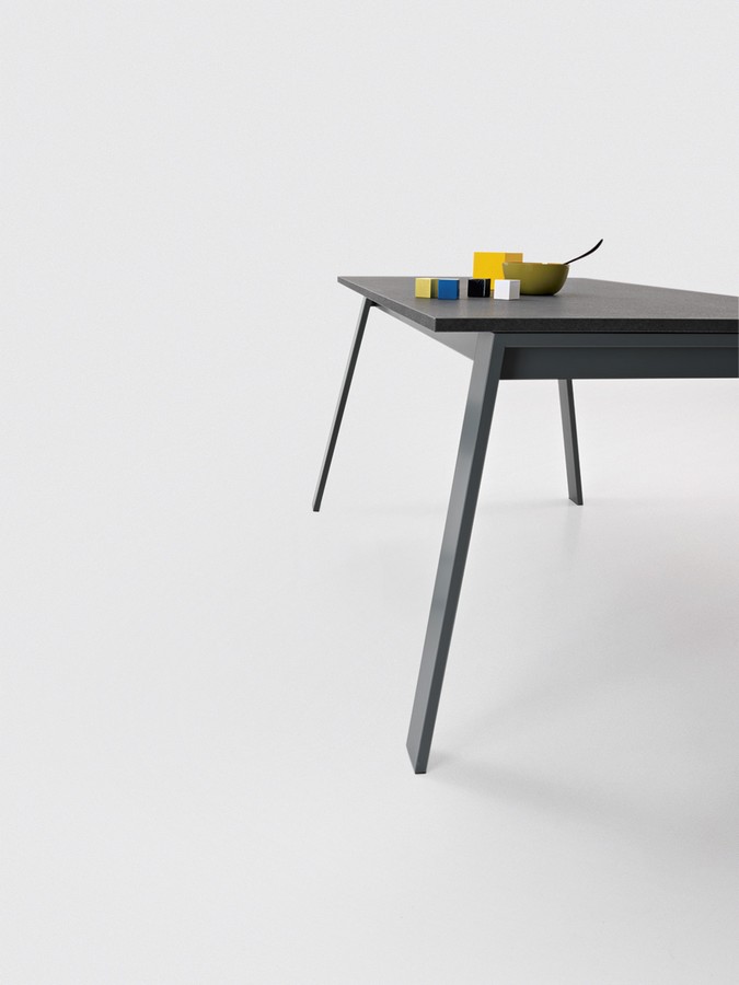 Der Delta Tisch entstand aus dem Wunsch, ein funktionales Produkt mit individueller Ästhetik zu entwerfen. Charakteristisch für ihn sind sein fester Tischfuß und der geneigte Rahmen. Der Öffnungsmechanismus ist auf Aluminiumschienen montiert. Die Tischplatte ist in Melamin, Laminat oder Hartglas erhältlich.