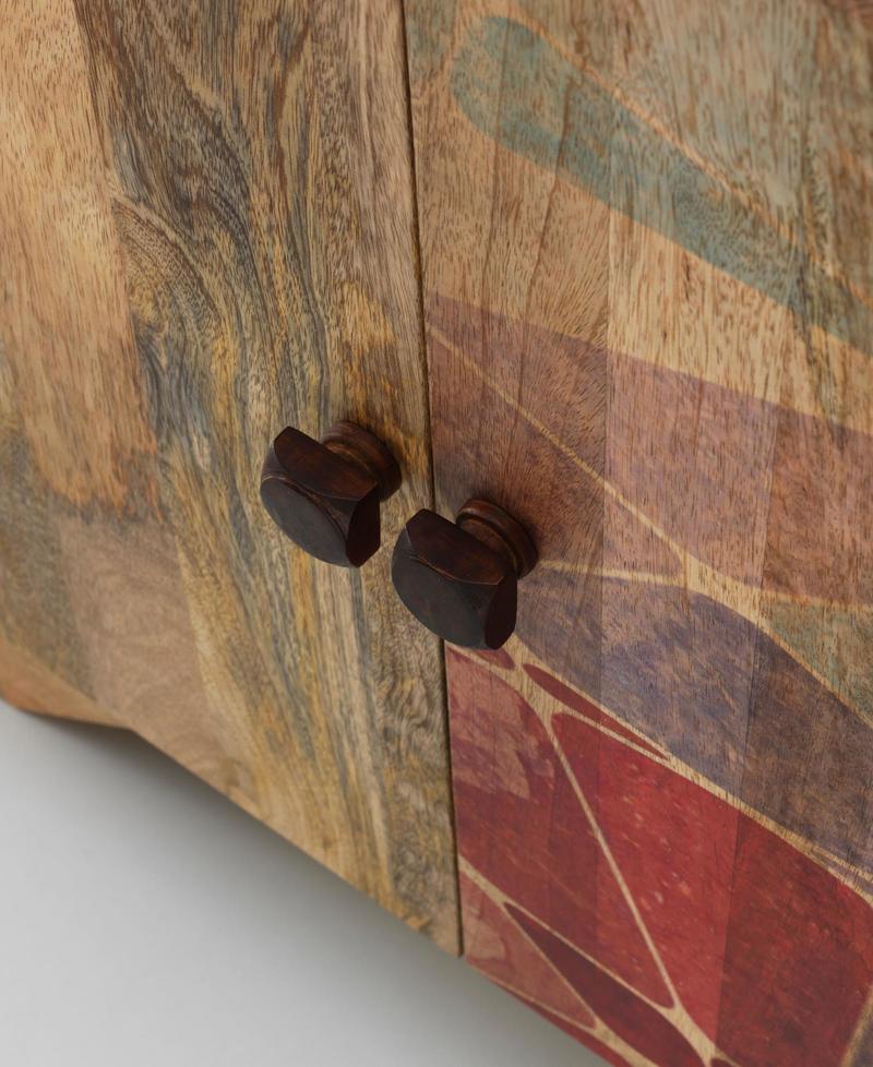 Der Rachi-Schrank besteht aus Massivholz mit einem mehrfarbigen geometrischen Finish.
