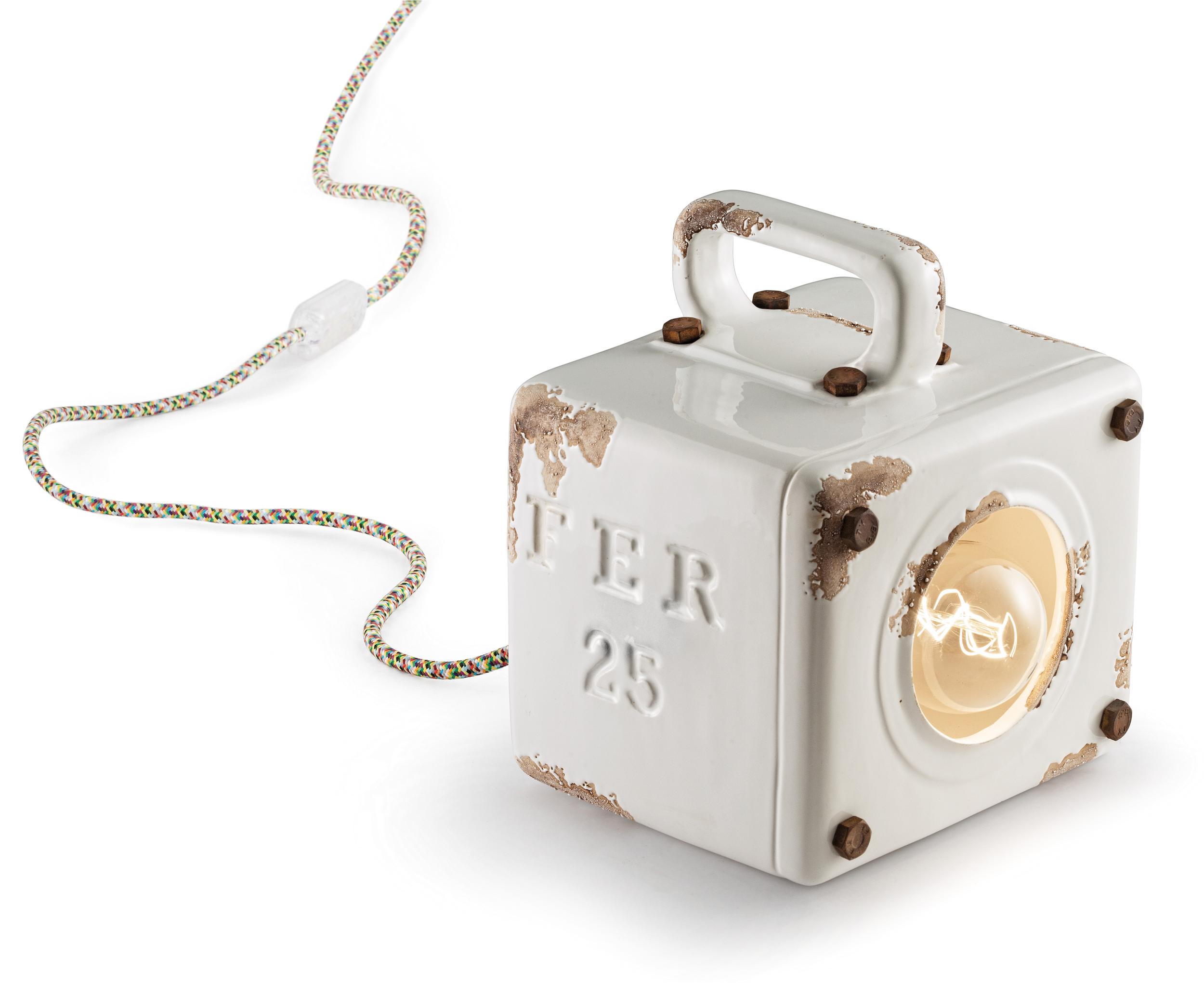 RETRO' INDUSTRIAL C1650 Tischleuchte von Ferroluce. Keramiklampe, Metallteile aus antikem Corteneisen und mehrfarbig ummanteltes Baumwollkabel.