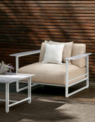 Der Couchtisch aus der Riviera-Kollektion von Talenti, der über ein lackiertes Aluminiumgestell und eine Tischplatte aus Feinsteinzeug verfügt und für den Außenbereich geeignet ist, ist in drei Größen erhältlich.