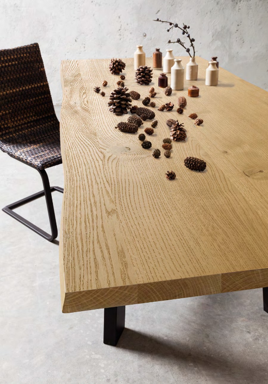Fester Tisch mit zentraler Basis aus epoxidpulverlackiertem Metall. Besonderheiten des Sockels sind die sichtbaren Verbindungen, die dank der Laserschneidtechnologie hergestellt werden. Die ausziehbare Version verfügt über einen synchronisierten zentralen Öffnungsmechanismus, der zwei 40-cm-Verlängerungen umfasst. Die Auswahl an Tischplatten variiert zwischen furniertem Holz, Laminat, glänzender und mattierter Keramik. Ein idealer Tisch für warme und einladende Umgebungen.