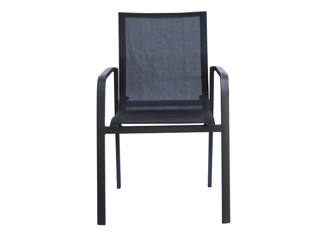 Das anthrazitfarbene Aluminiumgestell sorgt für Stabilität und geringes Gewicht, wodurch der Stuhl leicht zu bewegen und für den täglichen Gebrauch geeignet ist. Sitzfläche und Rückenlehne aus schwarzem Textilene bieten auch an heißen Tagen eine atmungsaktive und komfortable Oberfläche und sind zudem strapazierfähig und pflegeleicht.