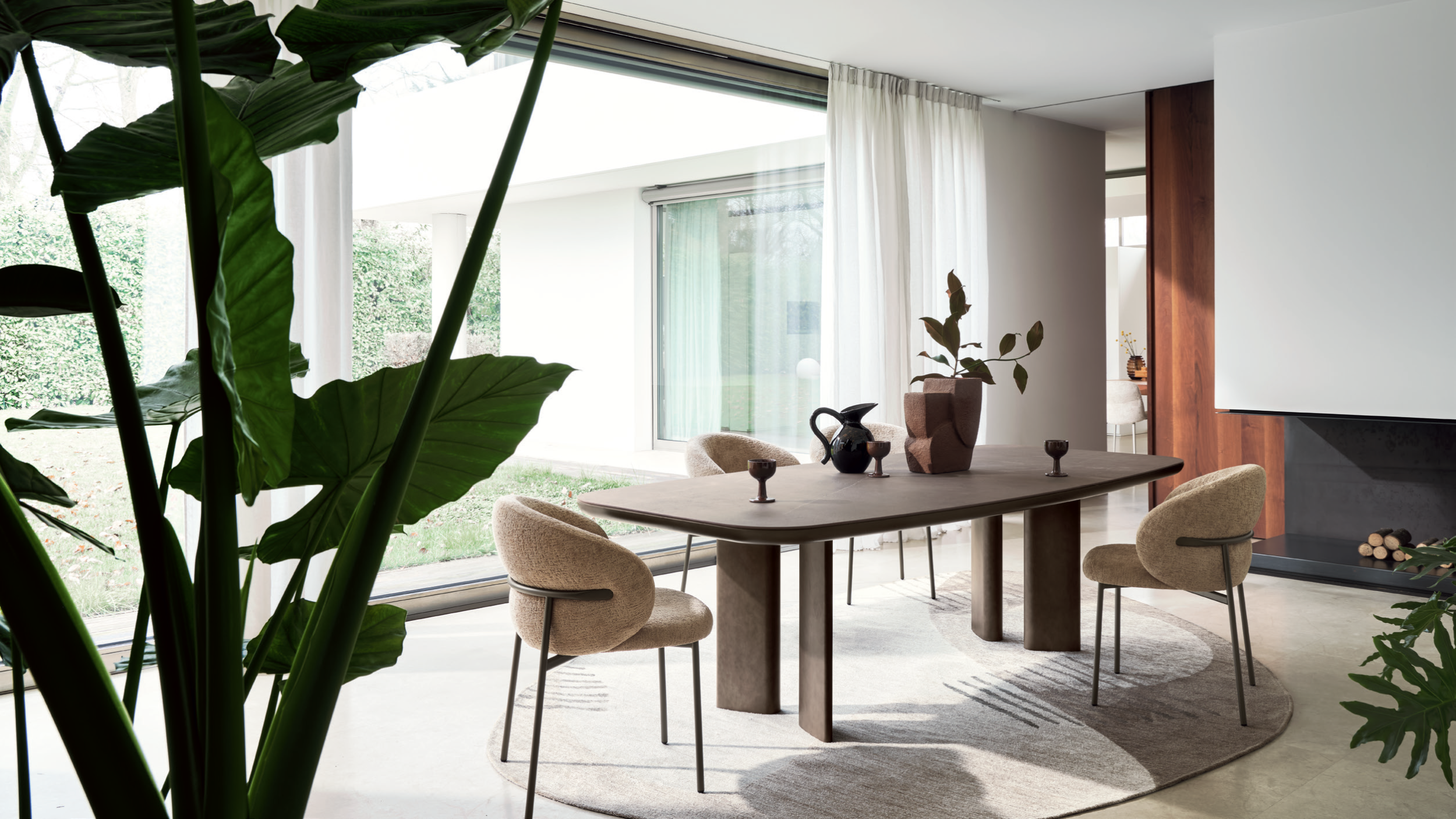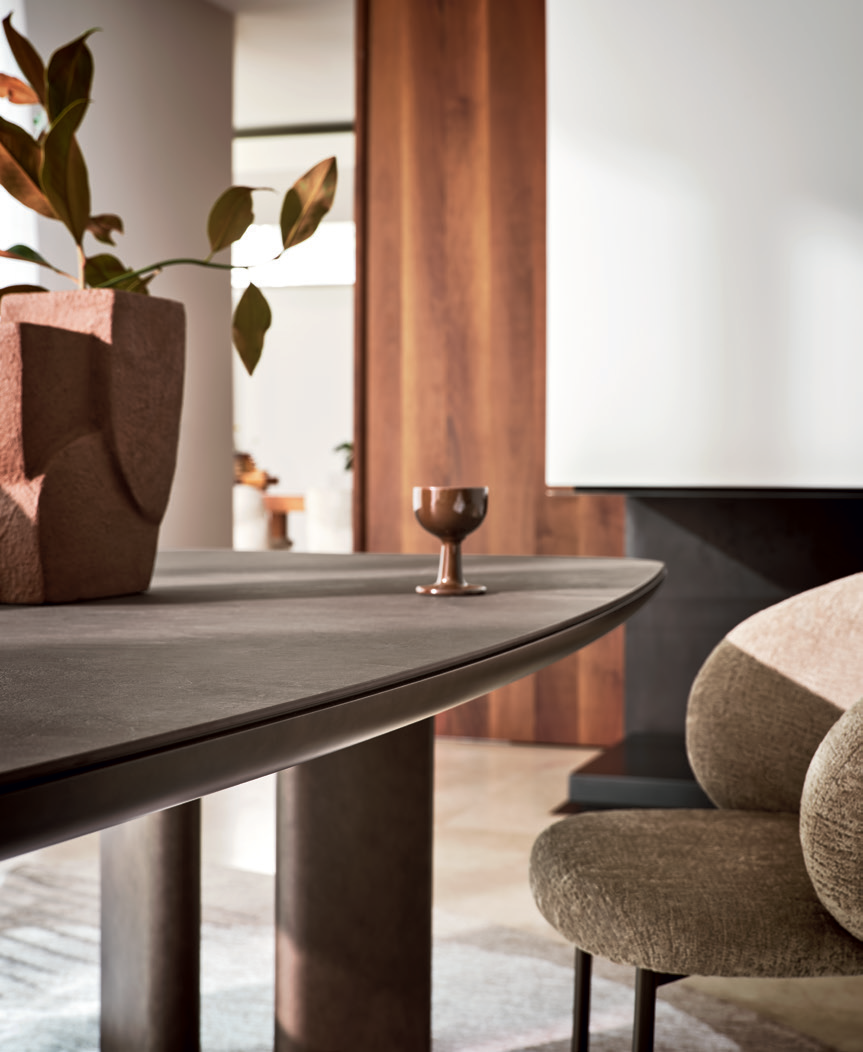 Ausziehbarer Tisch Sandy mit tropfenförmigem Bein, einem Abschnitt mit raffiniertem Design, der verschiedene Tischplattengeometrien aufnehmen kann.