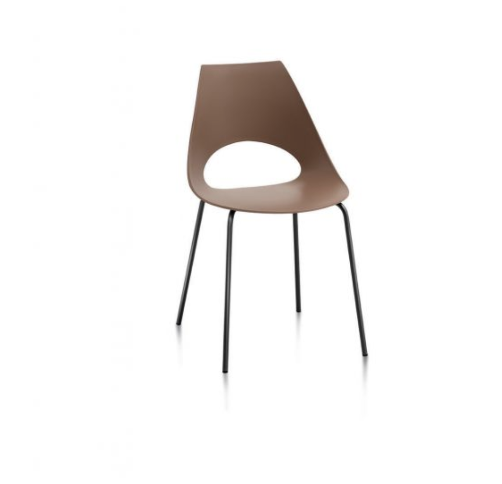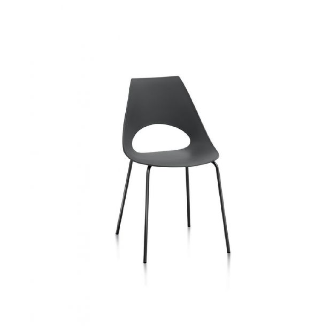 Shark-Stuhl von Bontempi mit lackierter oder verchromter Stahlstruktur, der umhüllende und ergonomische Sitz ist aus Polypropylen. Die Form der Rückenlehne ist sehr praktisch und leicht zu handhaben.