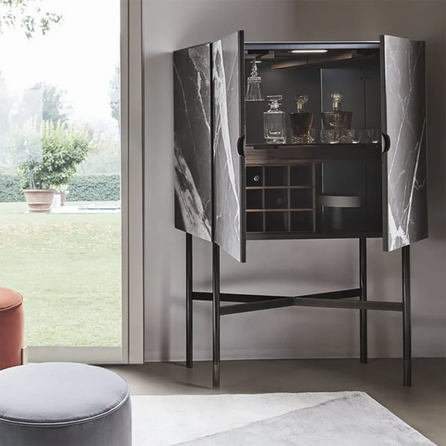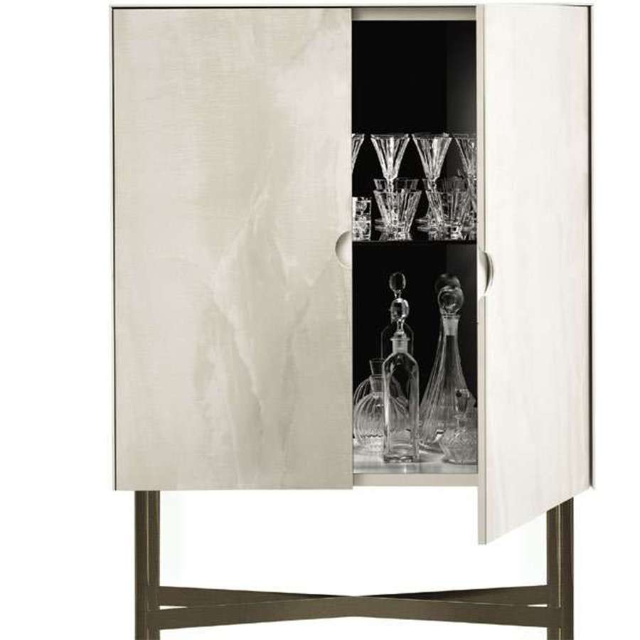 Sideboard aus Holz, bestehend aus zwei Flügeltüren, innerem Regal aus transparentem Kristall, innerer verspiegelter Rückwand. Oberseite, Seiten und Türen aus lackiertem Holz, Kristall oder Supermarmor, dekorative Füße und Griffe Ihrer Wahl.