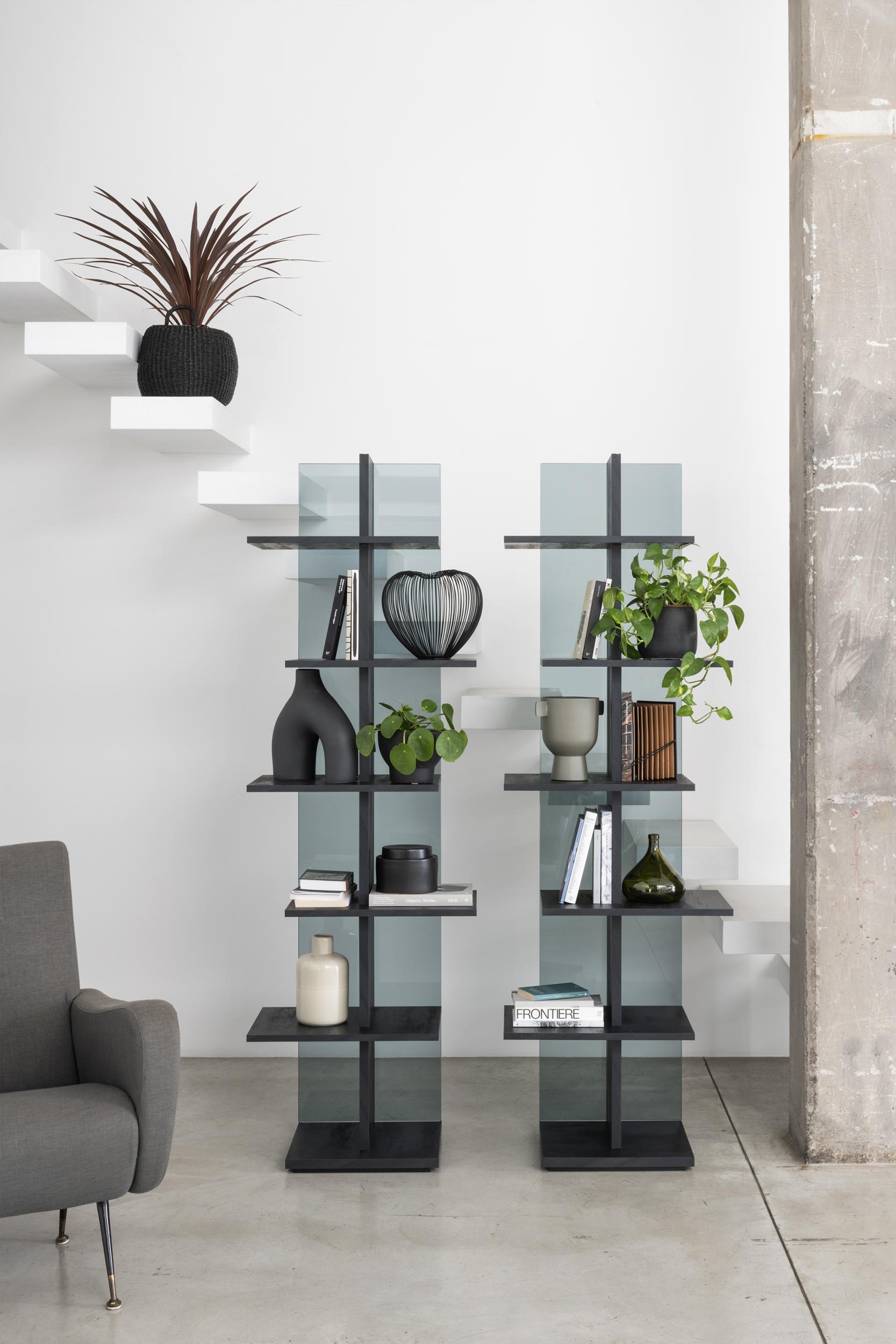 Dieses äußerst dekorative Designer-Bücherregal ist die ideale Lösung, um Räume elegant zu trennen. 10 mm starkes Sicherheitsglas sorgt für Stabilität, ohne den schlanken, eleganten Laminatrahmen zu beschweren. Das geräumige und robuste, freistehende Bücherregal verfügt über einen 25 mm starken Rahmen und 18 mm starke, umweltfreundliche Laminatböden. Ein 12 mm starker Stahlfuß (unter dem unteren Regalboden verborgen) gewährleistet zusätzliche Stabilität. Die Beschläge sind in Aluminiumoptik gehalten.