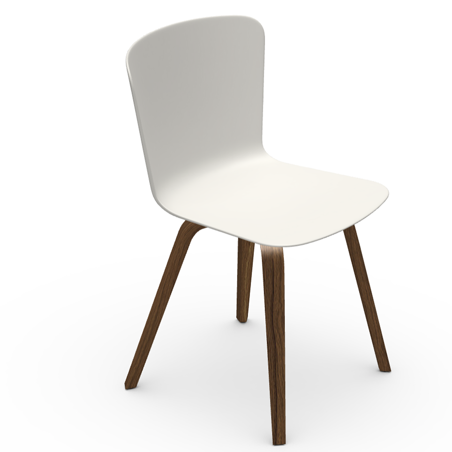 Calla-Stuhl mit Untergestell aus Eschenholz oder Furnier und Sitzschale aus Polypropylen oder gepolstert.