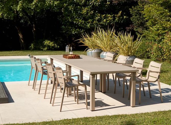 Ercole ist ein Gartentisch aus Technopolymer mit Lamellenplatte, der jeden Raum elegant einrichtet. Witterungsbeständig, pflegeleicht und reinigungsfreundlich, ist er der perfekte Ort für Abendessen mit Familie oder Freunden im Garten, auf der Terrasse oder am Pool. Maße: 170 x 100 x H.75. Dank des Verbindungssatzes können mehrere Tische perfekt ausgerichtet werden, ohne Platz zu verschwenden oder die Anzahl der Sitzplätze zu beeinträchtigen.