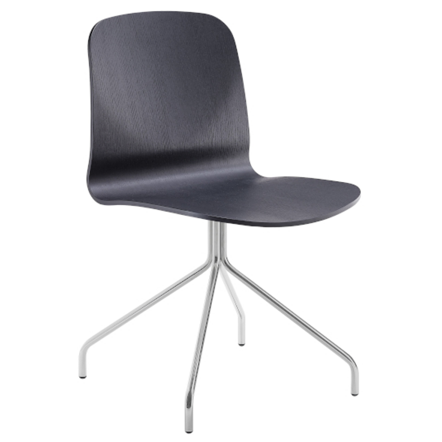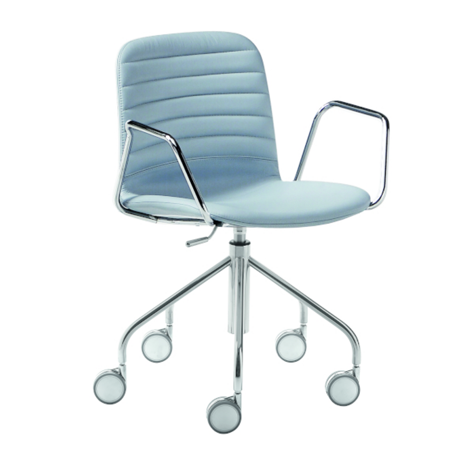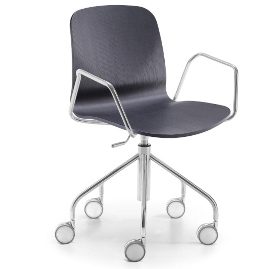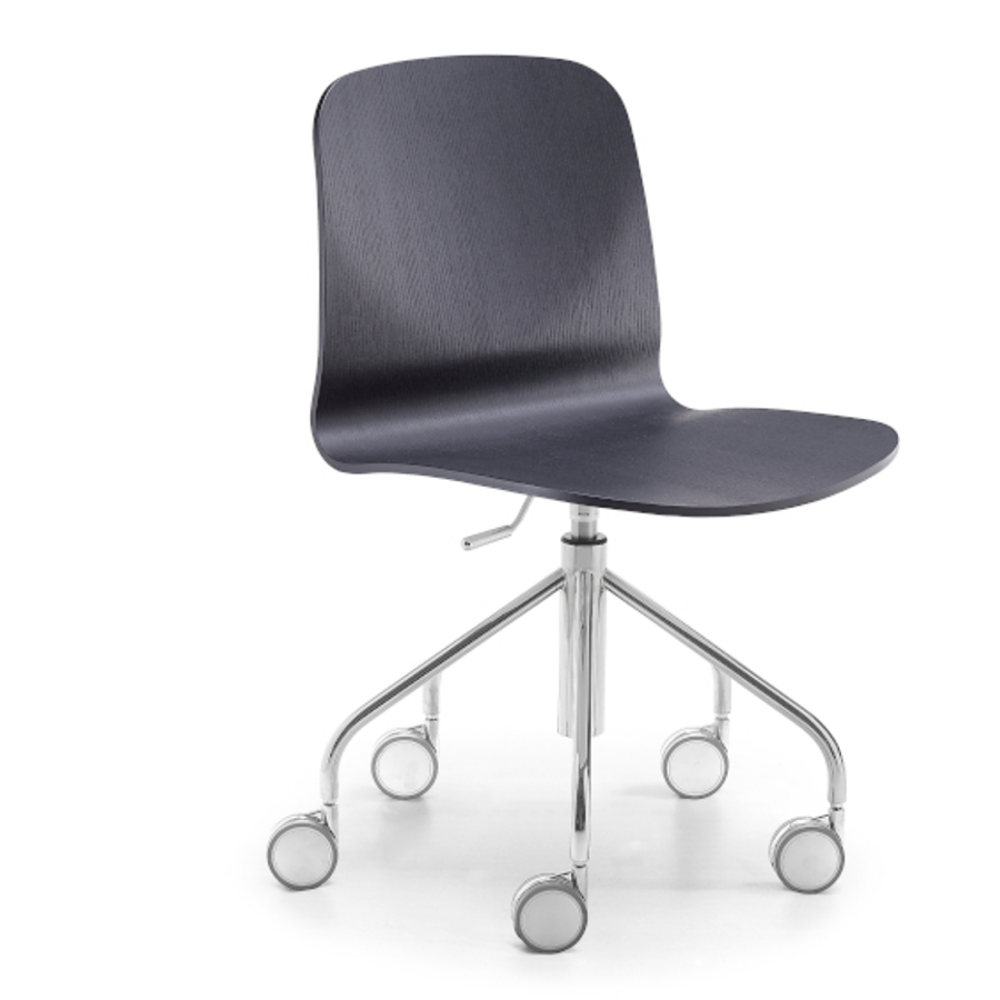 Drehstuhl Liù auf Rollen, drehbar und höhenverstellbar. Fünfsternfuß aus Stahl, Schale aus Holz.