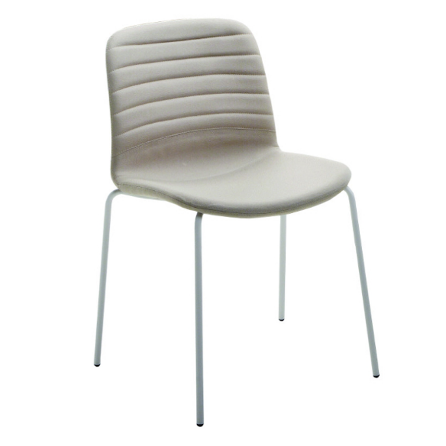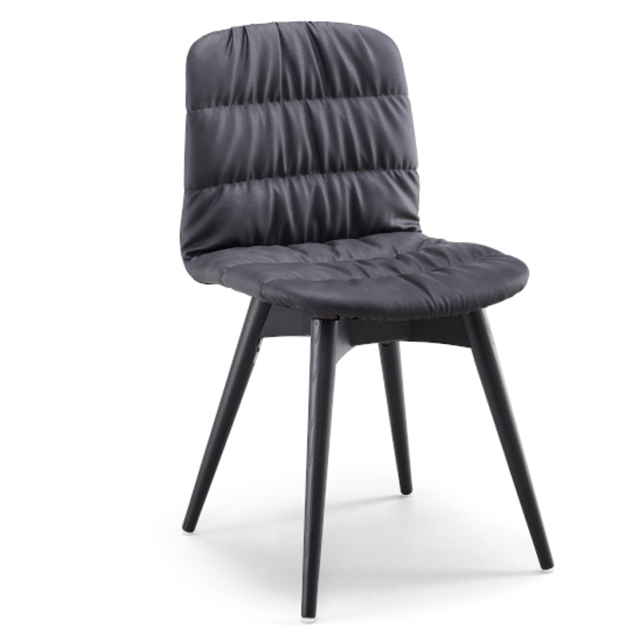 Liù Stuhl mit vier Beinen aus lackiertem Stahl und Holzschale. Es ist auch möglich, die mit Stoff oder Leder bezogene Version mit horizontalen Nähten oder Falten und zusätzlich die Rückseite aus Holz zu wählen.
