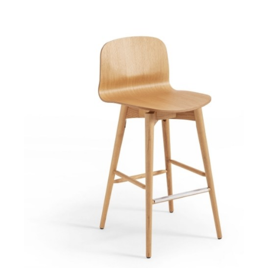 Hocker mit vierbeinigem Untergestell und Holzsitz.