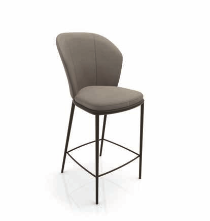Sunset C Hocker von Zamagna. Hocker mit konischem, dreieckigem Fuß aus lackiertem Metall, Sitzfläche und Rückenlehne aus Sperrholz mit Polsterung in verschiedenen Materialien und Farben.