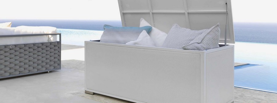 Talenti bietet diese praktische Truhe aus Aluminium und Textilene an, in der Sie alles, was Sie im Garten benötigen, bequem und einfach verstauen können. Ihre schlichte Form vermittelt ein Gefühl von Ordnung, Sauberkeit und Eleganz. Dank der robusten Materialien, einem Markenzeichen der Talenti-Qualität, hält sie auch widrigen Witterungsbedingungen stand.