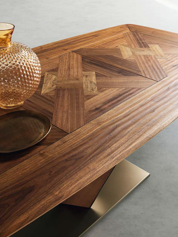 Terre di Sant'Erasmo: Tisch in limitierter Auflage mit 100 nummerierten und gebrandeten Stücken. Inspiriert von der Verarbeitung von Walnussholz, typisch für die Serenissima-Republik Venedig im 17. Jahrhundert: Das Massivholz wird mit farbigen Erden und natürlichen Pigmenten auf Basis von Stahloxiden und Ton gefärbt, die warme und weiche Farbtöne ergeben. Zentrales geometrisches Intarsienmotiv aus nationalem Nussbaum, eingerahmt aus Canaletto-Walnuss, alles von Hand bearbeitet und veredelt.