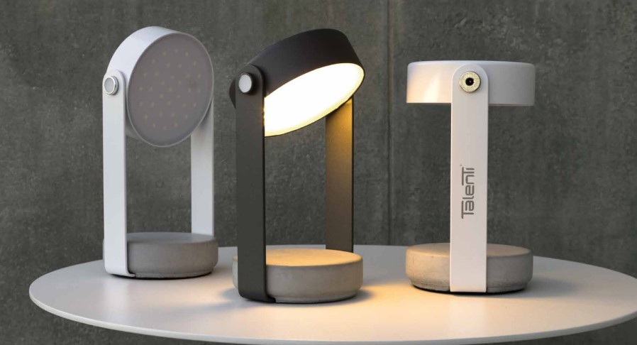Die Tofee-Lampe von Talenti verfügt über eine pulverbeschichtete Aluminiumstruktur, ist verstellbar und wird von wiederaufladbaren LEDs beleuchtet.
