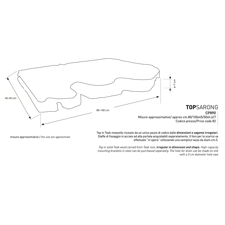 Top Sarong von Cipì aus massivem Teakholz, gewonnen aus einem einzigen Wurzelstück mit unregelmäßigen Abmessungen und Formen, behandelt mit natürlichem Wachs. Diese Behandlung hinterlässt einen leichten Schutz auf dem Holz, der bei Bedarf mit CIPÌ-Wachs oder Ölwachs wiederholt werden kann! Die Löcher und Unebenheiten im Teakholz sind ein Beweis für die Natürlichkeit unserer Tischplatte. Wandhalterungen nicht im Lieferumfang enthalten. Jedes Stück ist ein Unikat und es wird ein Fotoauswahlservice „vorbestellt“ angeboten