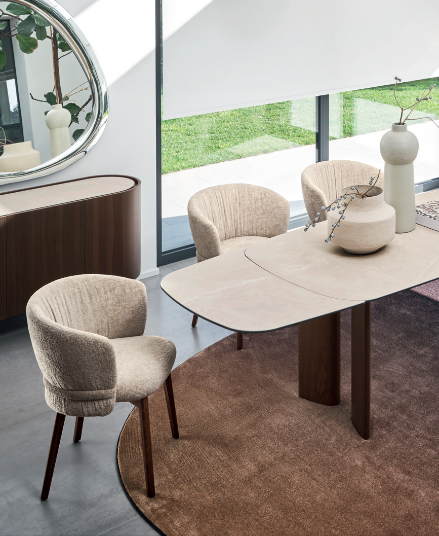Vanilla ist ein Stuhl, dessen Proportionen und Komfort an einen kleinen Sessel erinnern. Inspiriert von der Modewelt zeichnet er sich durch markante Raffungen im Stoff und ein horizontales Element aus, das die Rückenlehne wie ein Gürtel umschließt. Die Holz- und Metallbeine unterstreichen seine natürliche Eleganz.