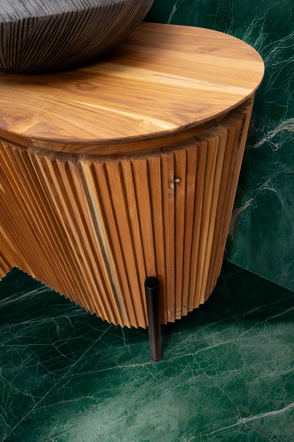 Zwei praktische Türen ermöglichen den Zugang zu großzügigen Stauräumen, die Füße aus schwarzem Teakholz straffen die Möbel und unterstreichen die vollständig handgefertigte „Zahnrad“-Verarbeitung, und die 45°-Platte schließt die Geometrien stilvoll ab. Natürliches Teakholz der Klasse A, raffinierte Formen und Volumen, ohne Griffe oder sichtbare Metalldetails für ein Möbelstück, das vom „Bolidismus“ geprägt ist. Nur extra trockenes, massives Teakholz, um maximale Leistung zu gewährleisten. Die Oberseite ist mit natürlichen Wachsen behandelt, die Wasser widerstehen bzw. mit Wasser koexistieren sollen!