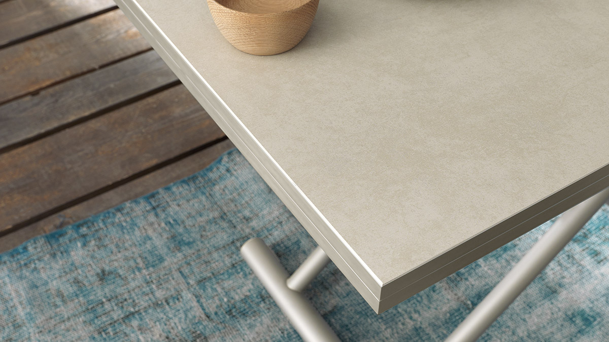 Couchtisch, umwandelbar in einen Esstisch, Metallbasis, Gasmechanismus, millimetergenau höhenverstellbar von 16 cm bis 78 cm, doppelt klappbare Platte aus Melamin, Glas, Mörteleffekt oder Keramik. Einziehbare Räder.