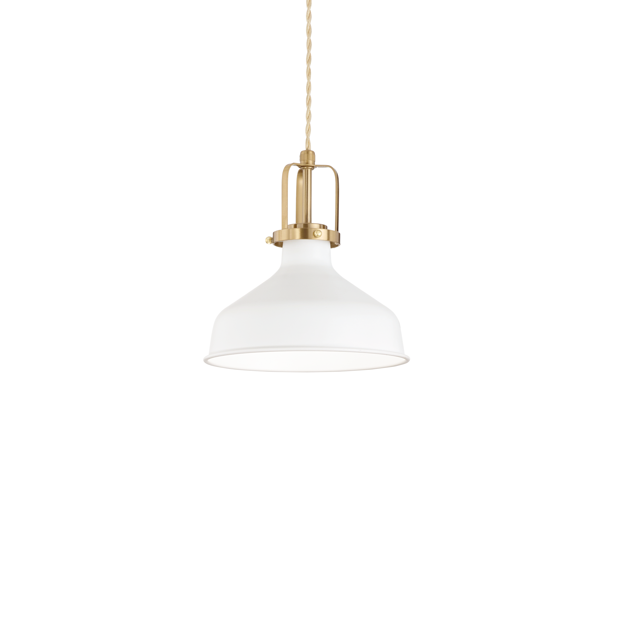 Weiße Hängeleuchte ERIS-1 SP1 von Ideal Lux mit Metallrahmen mit weiß lackierter Rosette und Diffusor, Details in satiniertem Goldfinish. Geflochtenes Elektrokabel mit Stoffummantelung. Glühbirne ausgeschlossen.