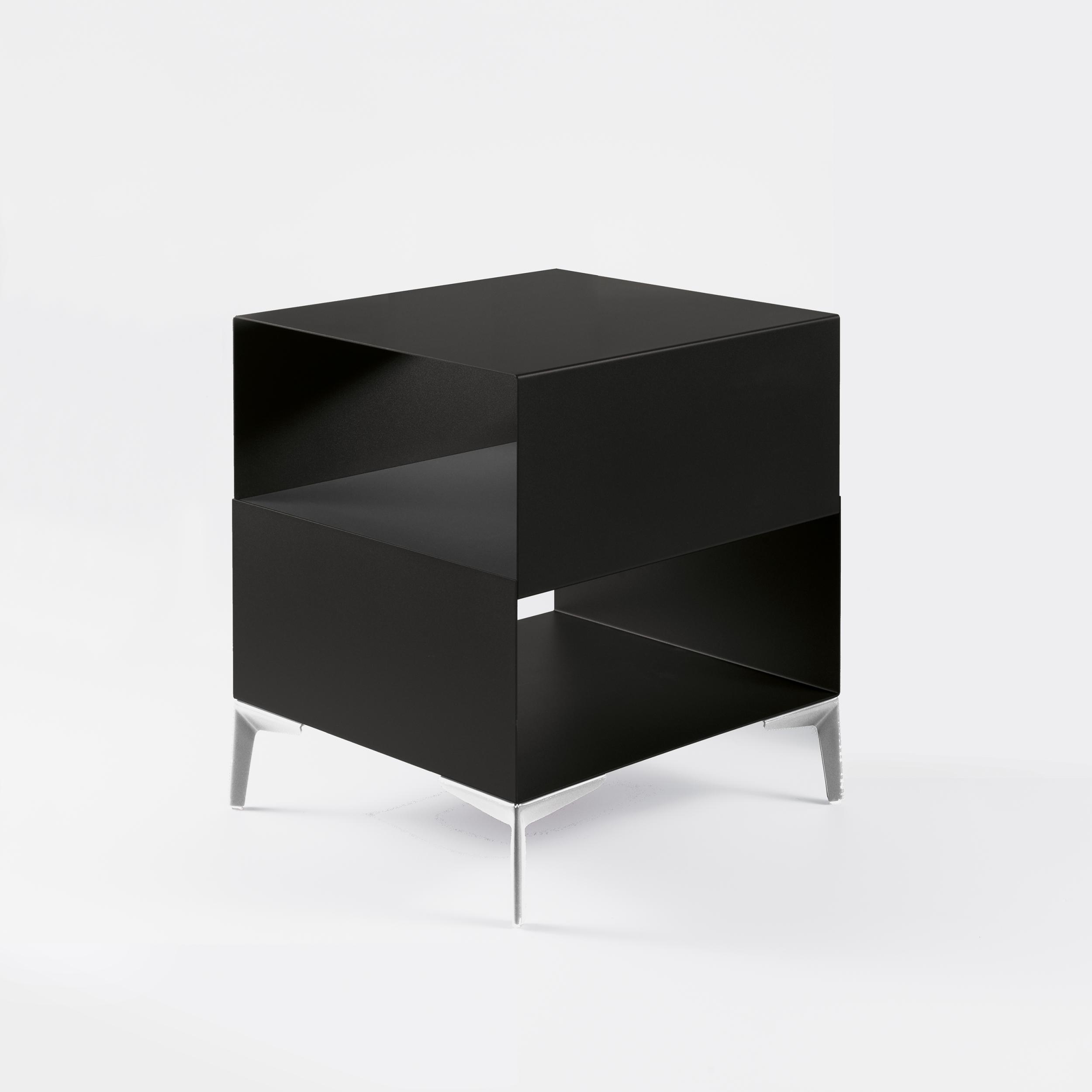 Der Cube-Couchtisch von Pezzani ist ein vielseitiger Beistelltisch (der sich auch ideal als Nachttisch eignet) mit viel Stauraum für Bücher, Zeitschriften und andere Utensilien. Das Gestell besteht aus lackiertem Stahl mit sandgestrahlter Oberfläche, die eingelassene Ablagefläche in der Mitte aus umweltfreundlichem Laminat und ist in verschiedenen Farben erhältlich. Die vier vom Kunden ausgewählten Designfüße können farblich auf das Gestell abgestimmt oder verchromt werden.