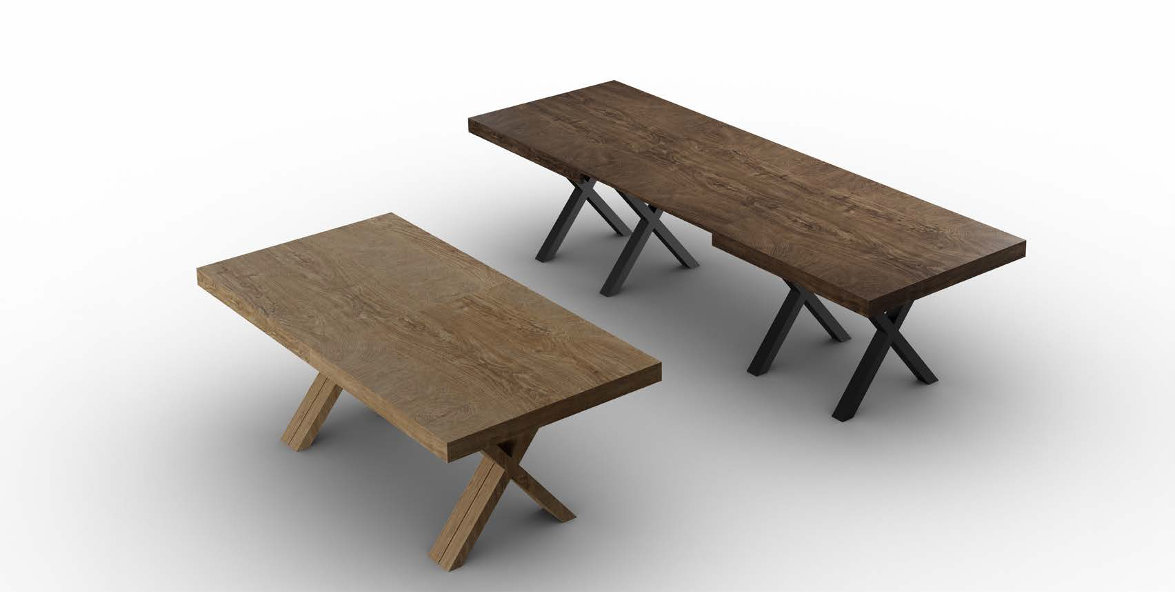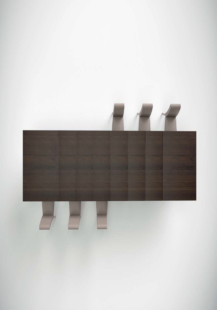 Ausziehbarer rechteckiger Tisch mit beschichtetem MDF-Untergestell, Melaminplatte und Verlängerungen in verschiedenen Ausführungen. Ausziehbarer Holzmechanismus mit der Möglichkeit, den Tisch mit 6 Verlängerungen von 50 cm Länge von 2 auf 5 m zu verlängern, die im geschlossenen Zustand alle im Inneren des Tisches untergebracht sind.