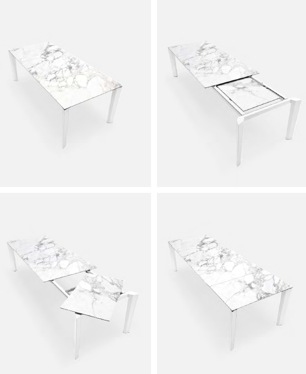 TAVOLO ALLUNGABILE E GAMBE SEMPRE PERIMETRALI - ALLUNGA MONTATA SU TELAIO CON MOVIMENTO DI APERTURA GUIDATO