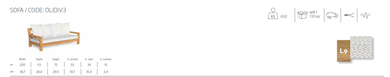 cm: L. 200 x P. 93 x H. 75 x H. braccioli 50 x H. seduta 39 x H. cuscino 15 ( quattro cuscini da 50 x 50 cm inclusi)