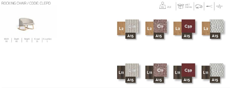 La morbidezza di CleoSoft Wood emerge con grande eleganza dalla poltrona a dondolo che il designer Marco Acerbis ha pensato in abbinamento con elementi living più geometrici alla ricerca di un equilibrio perfetto tra forma e volume. La struttura è in legno e la cuscineria è in tessuto sfoderabile, facile da lavare e resistente agli agenti atmosferici. L’imbottitura è in quick dry foam.