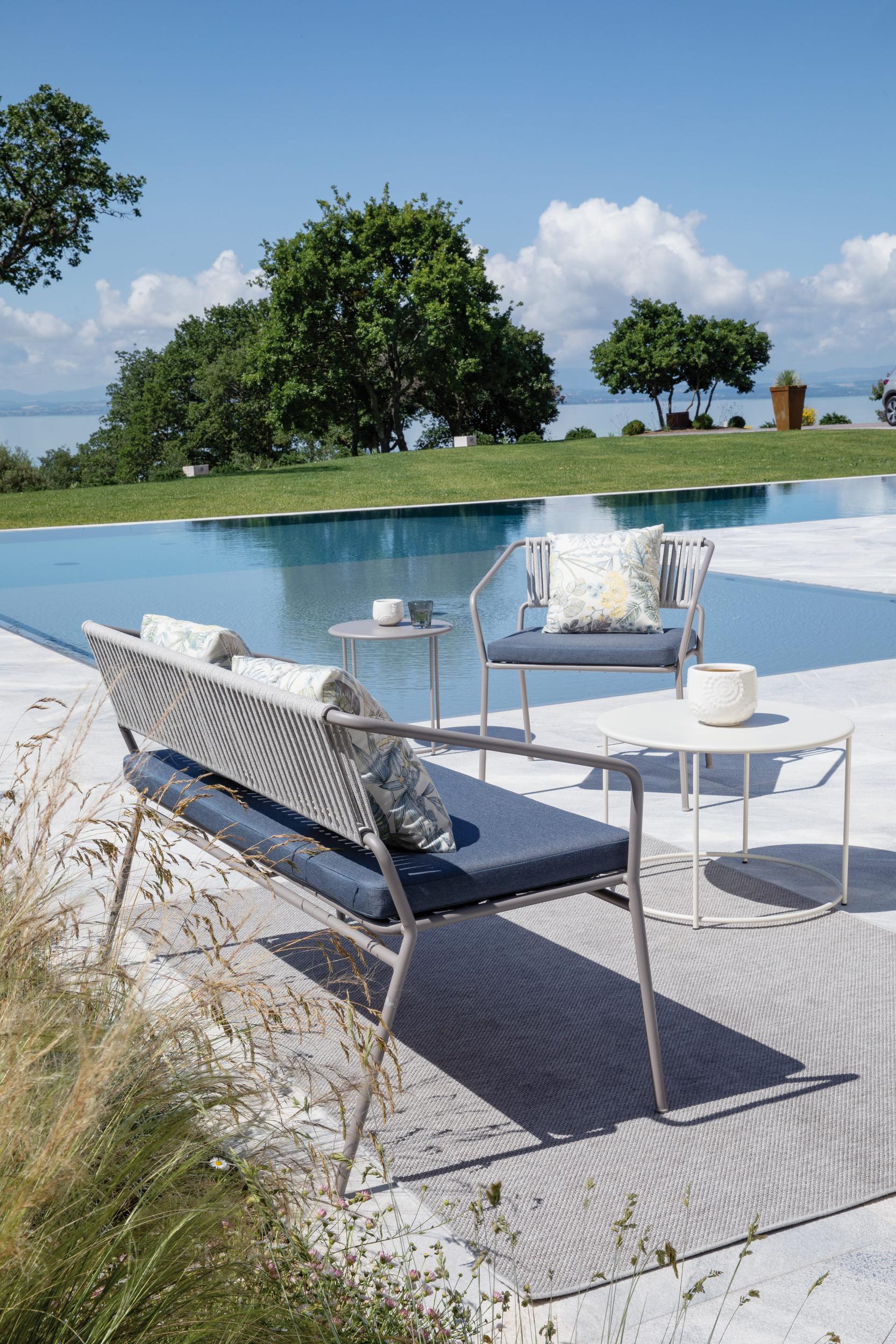 The 2-seater Slot sofa by Vermobil is made of galvanized iron and is available in various finishes and with matching rope, equipped with a soft cushion in matching fabric included in the price.