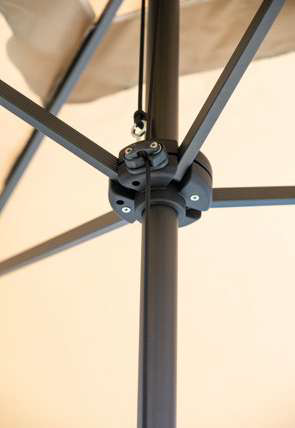 For stability, the umbrella features a 65 kg grit-coated concrete base. Galvanized steel handles make it easy to move, while a galvanized steel casing protects the base and adds to its sleek appearance.